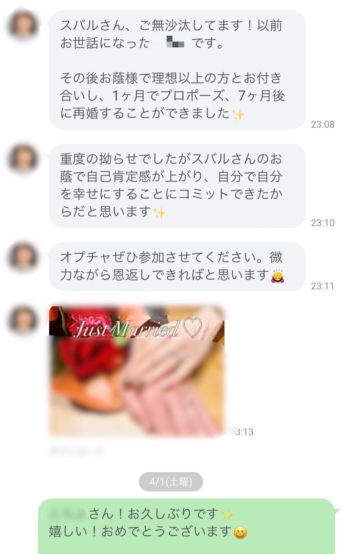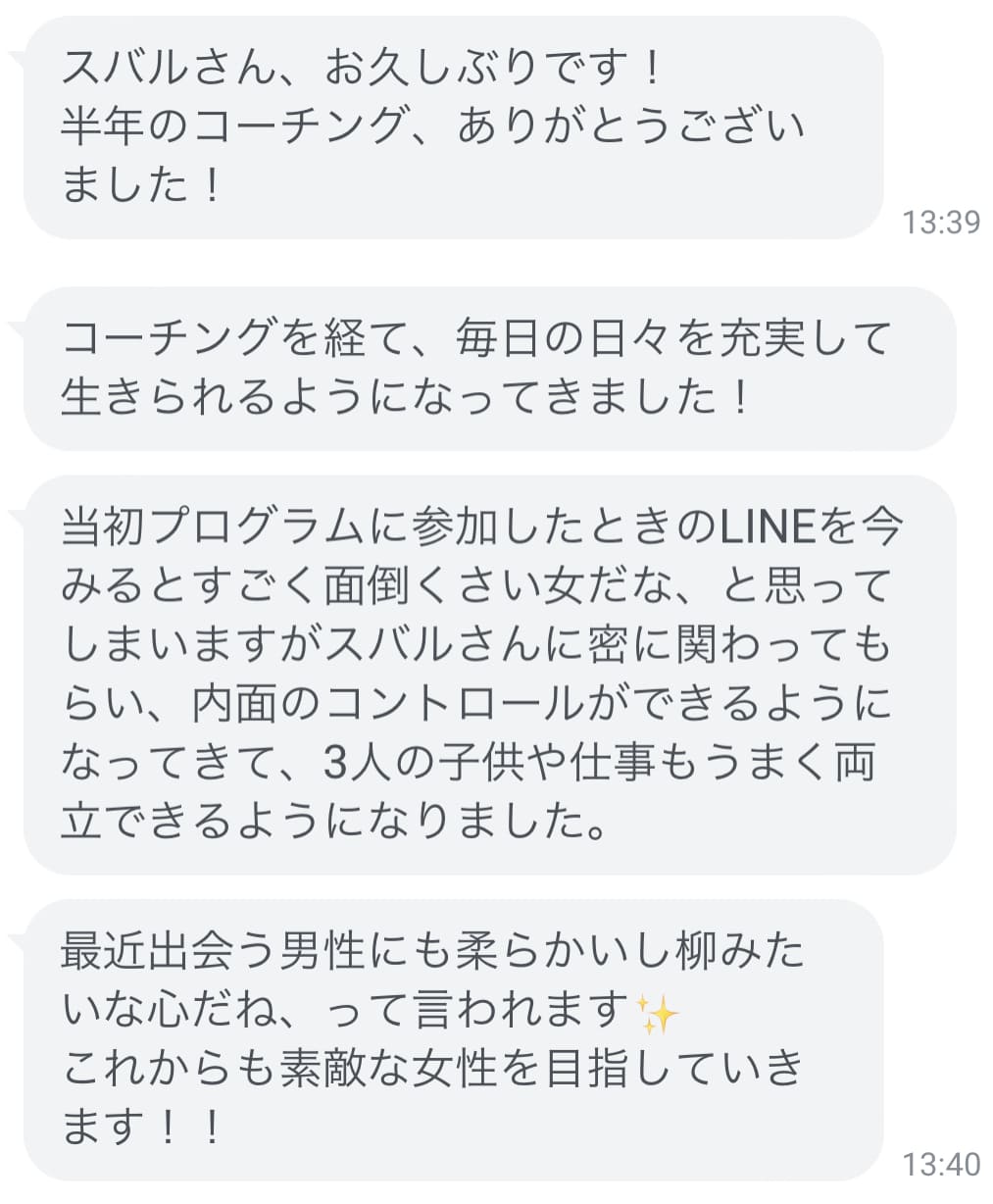 そうして彼とのコミュニケーションが変わり、愛情を取り戻していき、無事講座中にプロポーズされ結婚していきました。