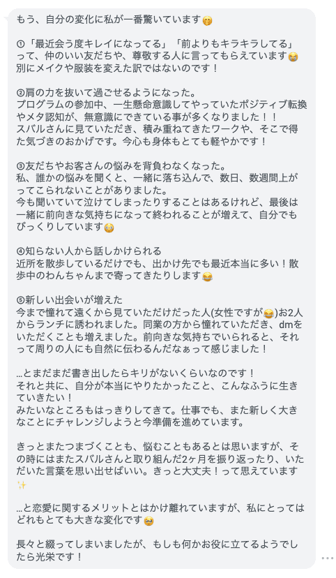 これまでも、今もなぜずっと苦しい恋愛ばかりなのか…と悩み続けていた中でスバルさんの講座を受けました。