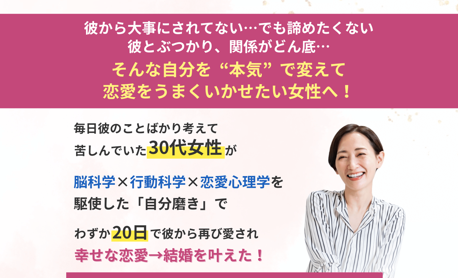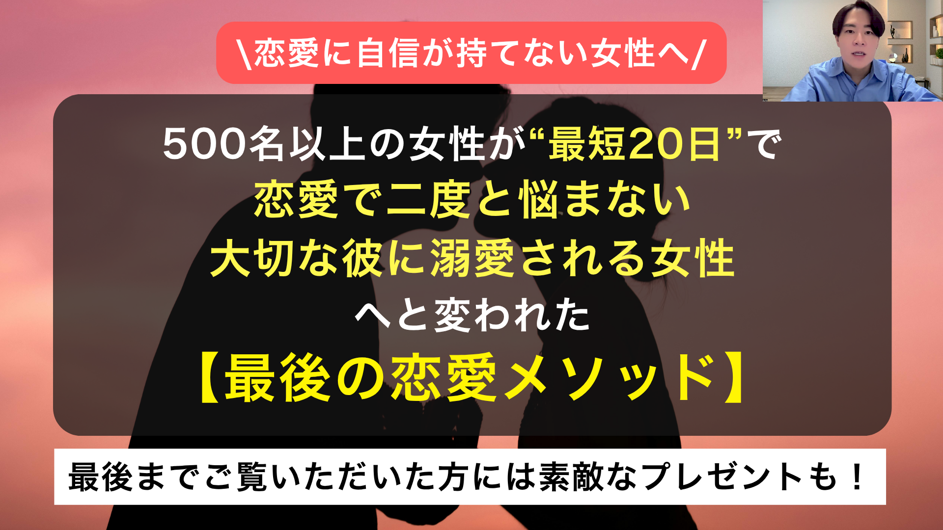 これまでたくさん苦しんできたあなたでも解決していけるように、恋愛を学ぶのを最後にして欲しいという思いでこの「最後の恋愛メソッド」を教えています。