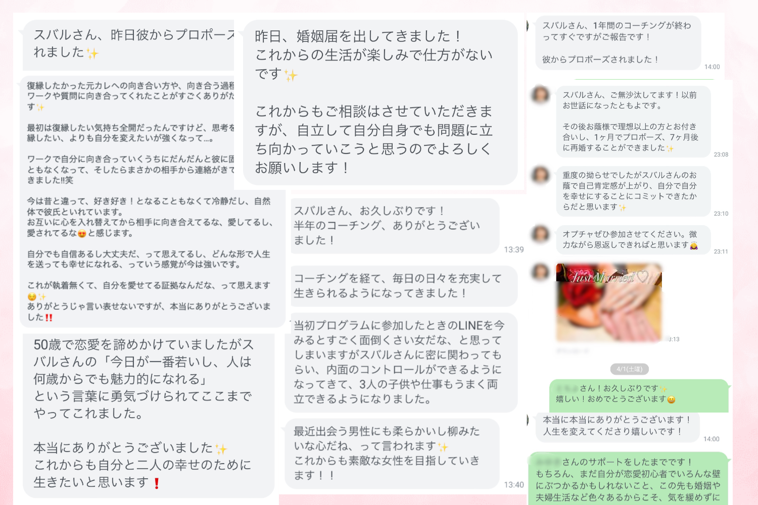 そうして彼とのコミュニケーションが変わり、愛情を取り戻していき、無事講座中にプロポーズされ結婚していきました。
