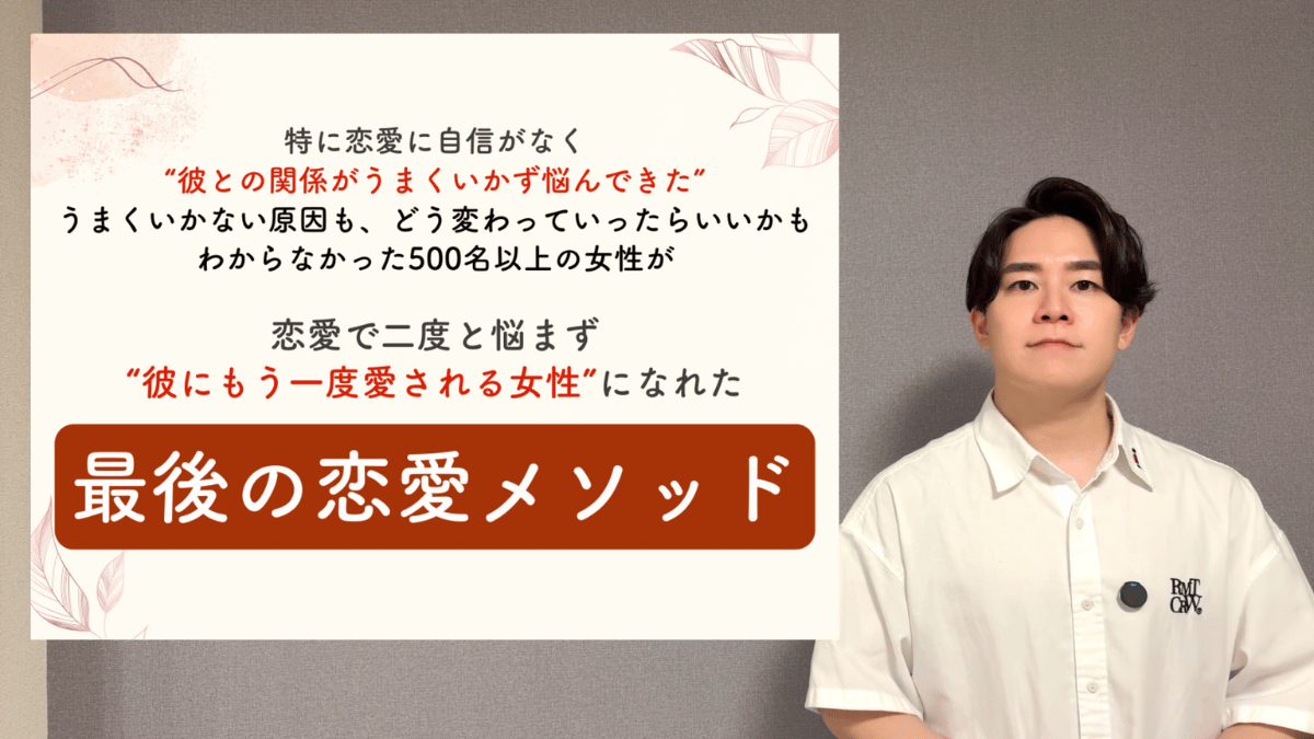 これまでたくさん苦しんできたあなたでも解決していけるように、恋愛を学ぶのを最後にして欲しいという思いでこの「最後の恋愛メソッド」を教えています。